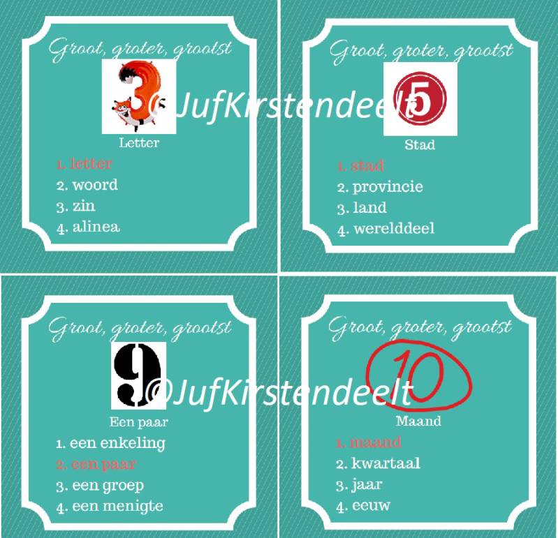 Bij dit spel worden de verschillende tijden van verschillende werkwoorden ingeoefend. De leerlingen moeten 4 kaarten te pakken krijgen van hetzelfde werkwoord. Bestaat uit 56! kaartjes.